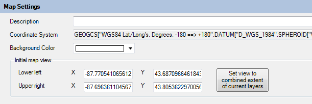 You can specify the coordinate system, background color and the initial extents that this map encompasses. The coordinate system and initial extents are automatically set when the first layer is added to this map. You can re-calculate the extent at any time.
